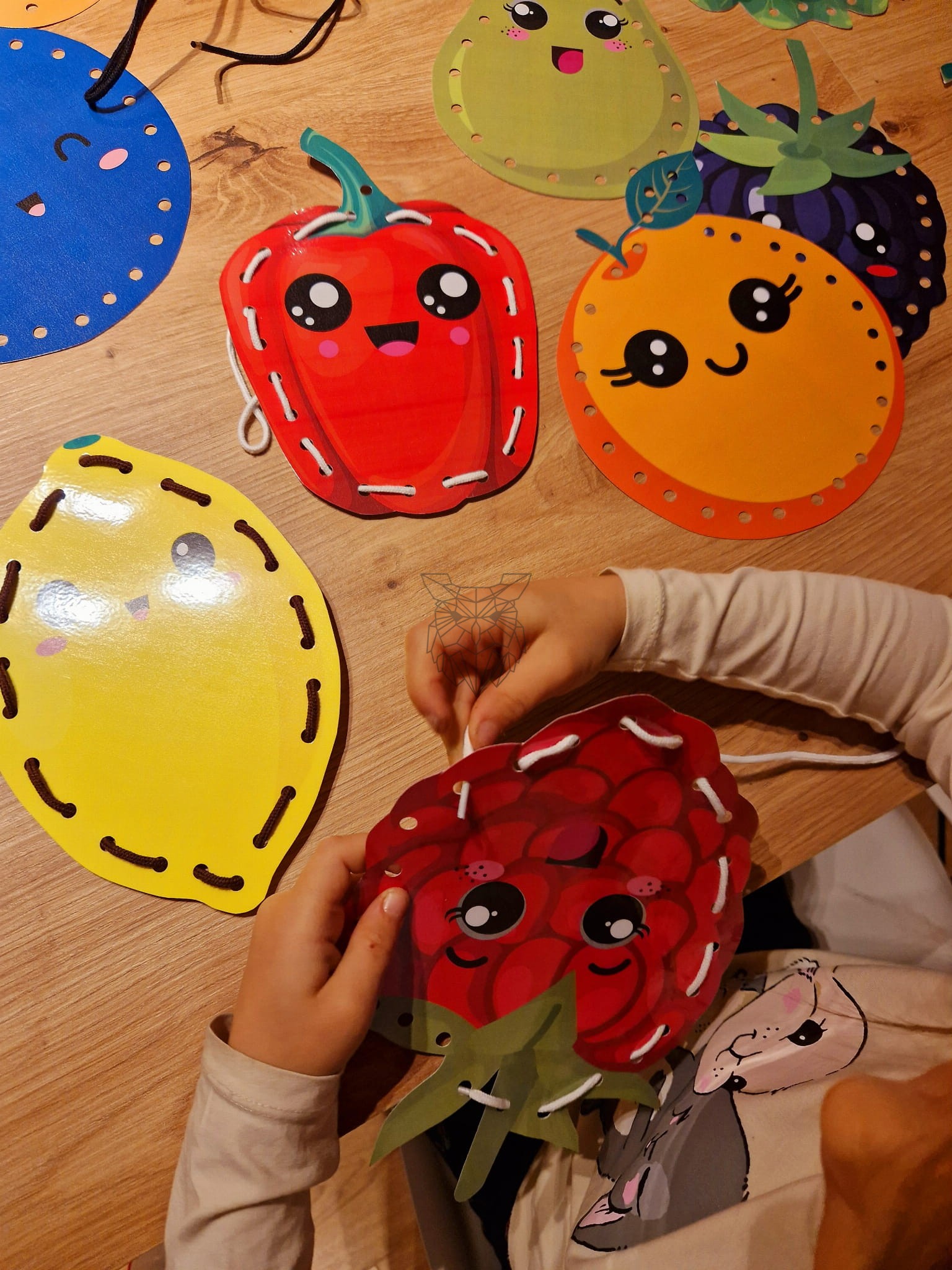 Zestaw zawiera 25 kolorowych, uśmiechniętych obrazków owoców i warzyw do ćwiczenia motoryki i sprawności małych rączek u dzieci dzięki przeplatywaniu sznurka przez małe dziurki.